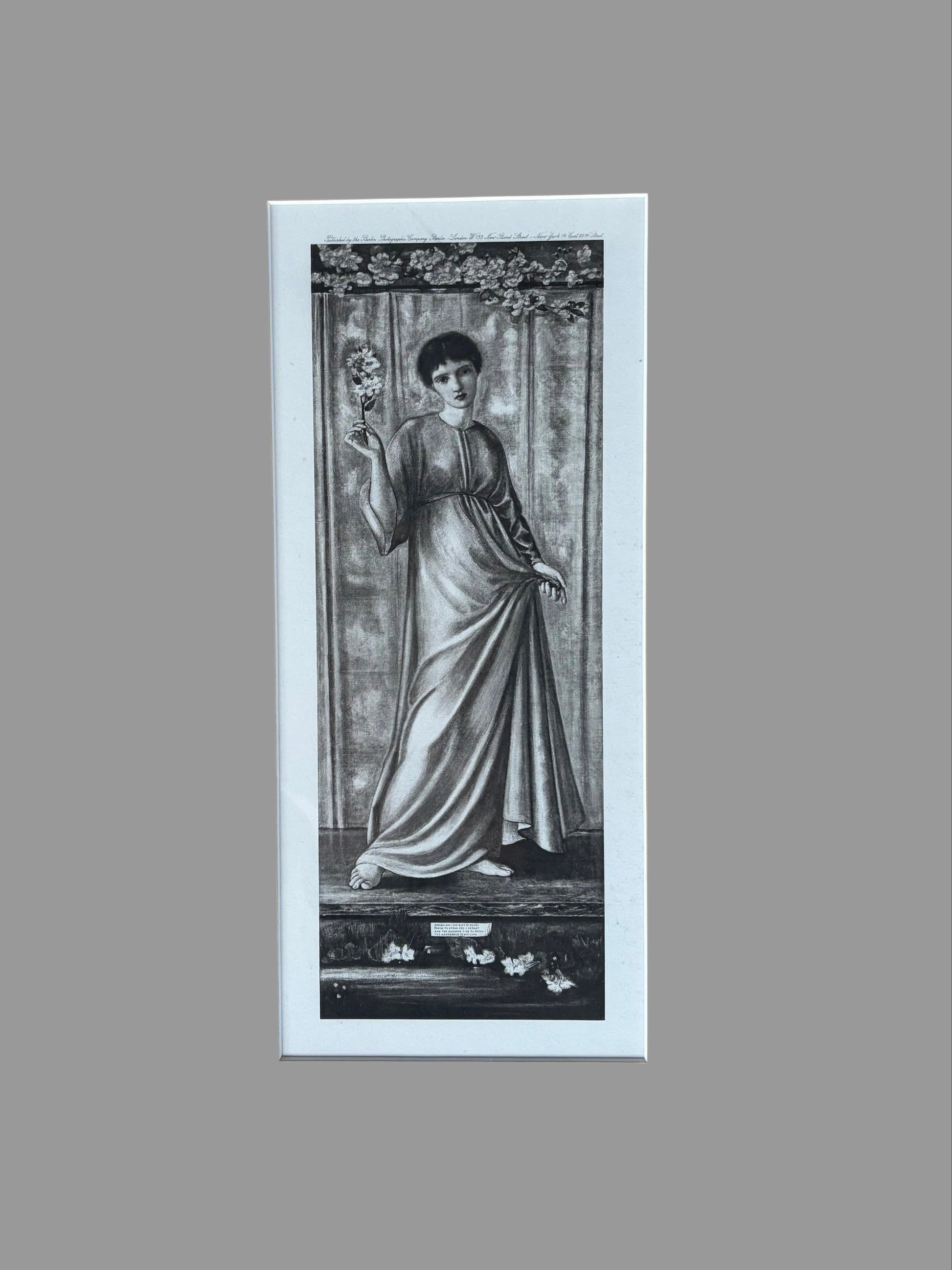 Complementing this are three exquisite photogravures after Burne-Jones depicting Spring, each 29 x 11cm, mounted and framed to museum standards. All pieces bear Maas Gallery provenance labels, attesting to their authenticity and curatorial significance. An exceptional ensemble for collectors of late 19th and early 20th-century academic and Aesthetic movement art.